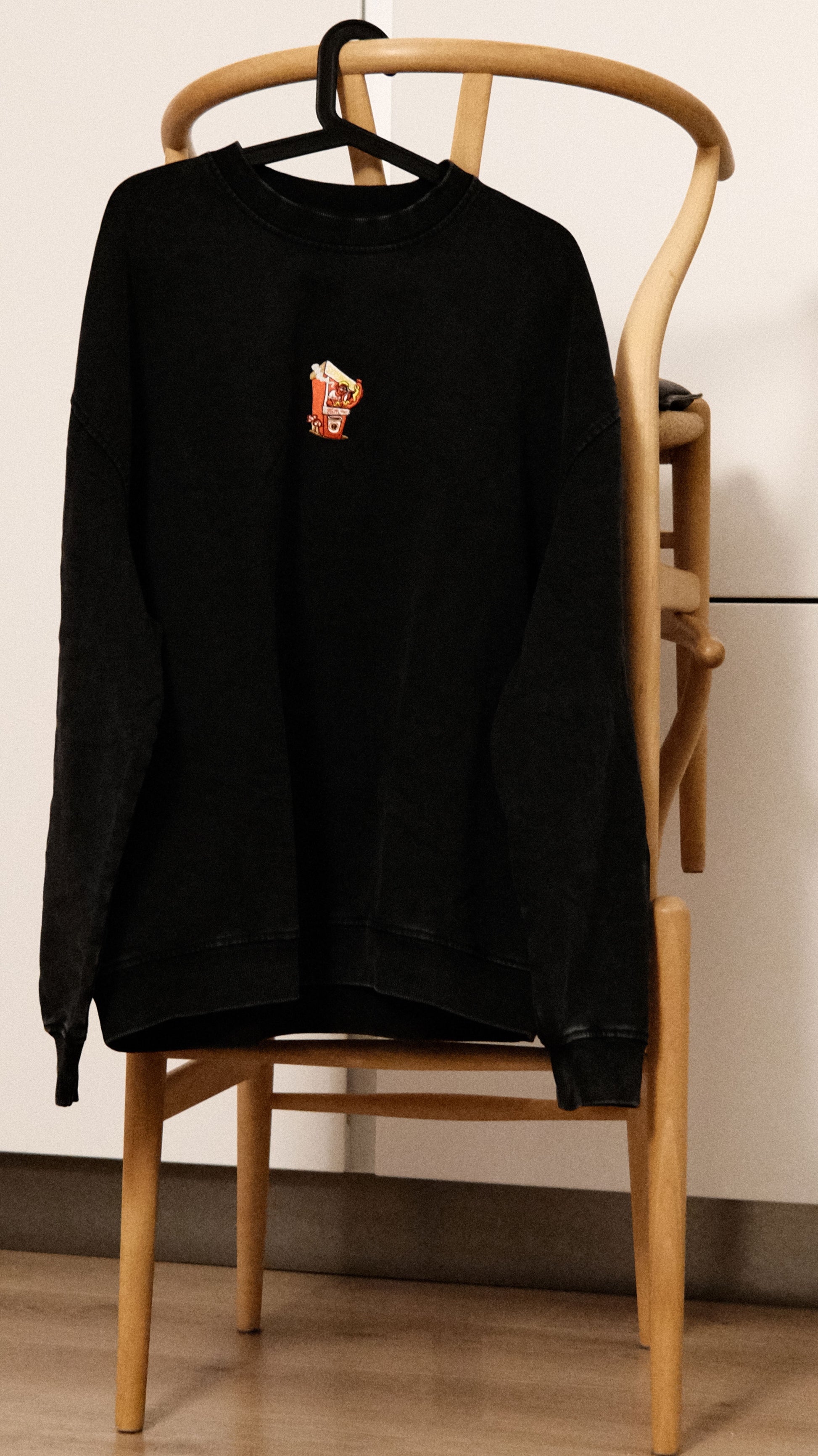 Den er oversized i snitt, droppede skuldre gir volum, og en washed finish gir genseren et dempet, vintage uttrykk som bare blir bedre med bruk.